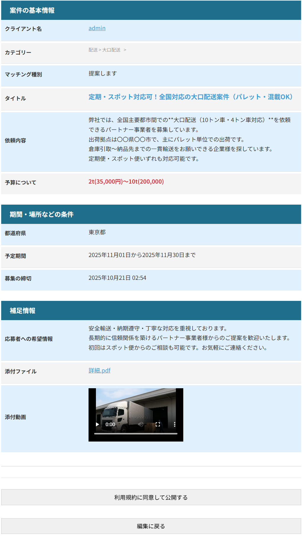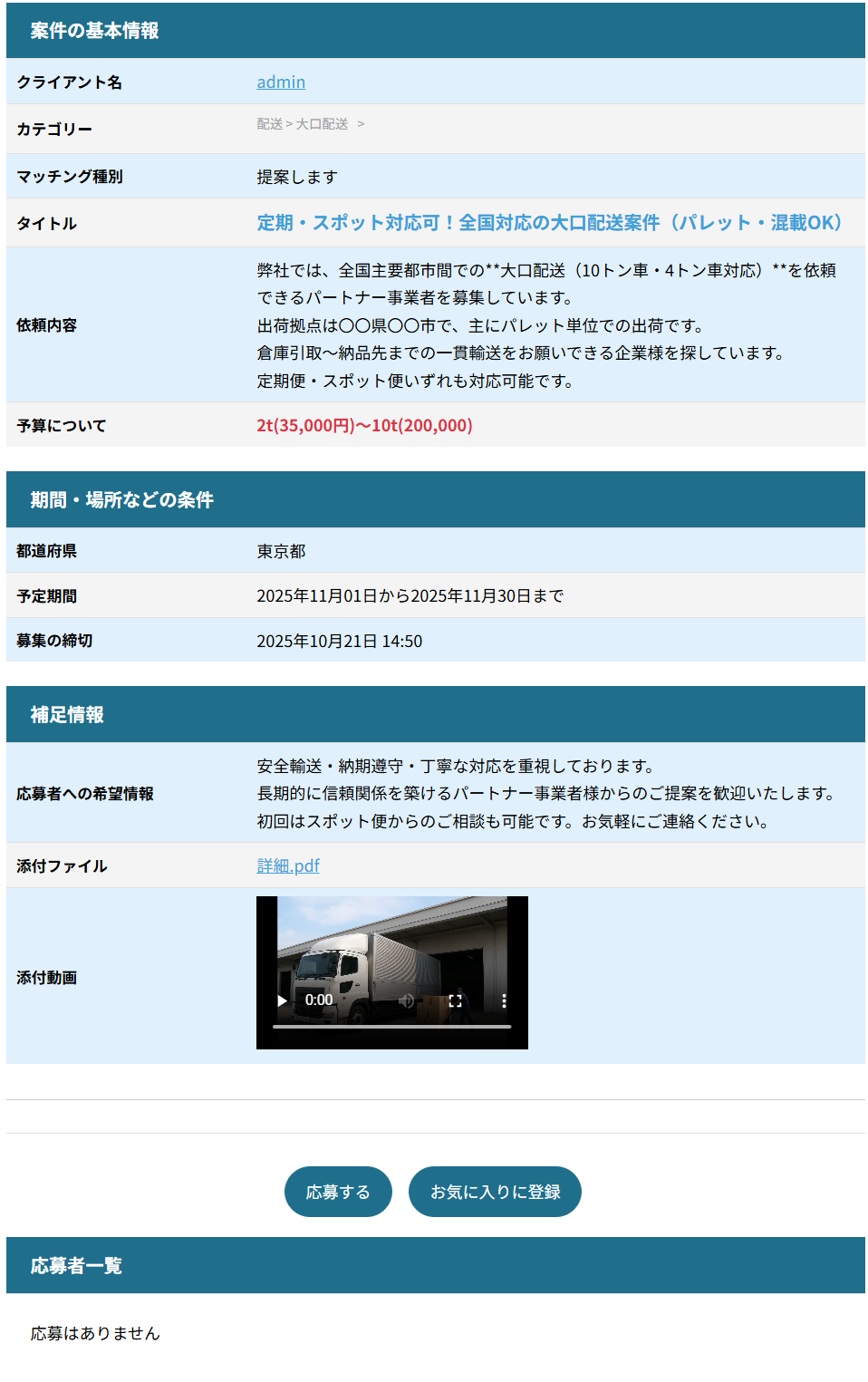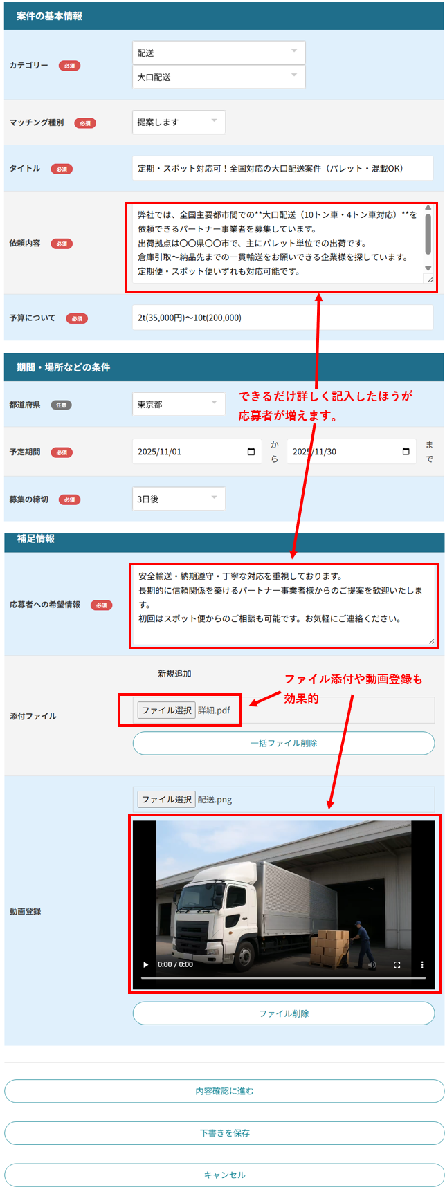 できるだけ詳しく記入したほうが、案件について理解が深まるため、応募者が増えます。また、文字だけで伝わりにくいことは、画像やPDFを添付したり、スマホで撮影したショート動画(1分まで)を投稿することで、案件の内容をスムーズに案内することができます。