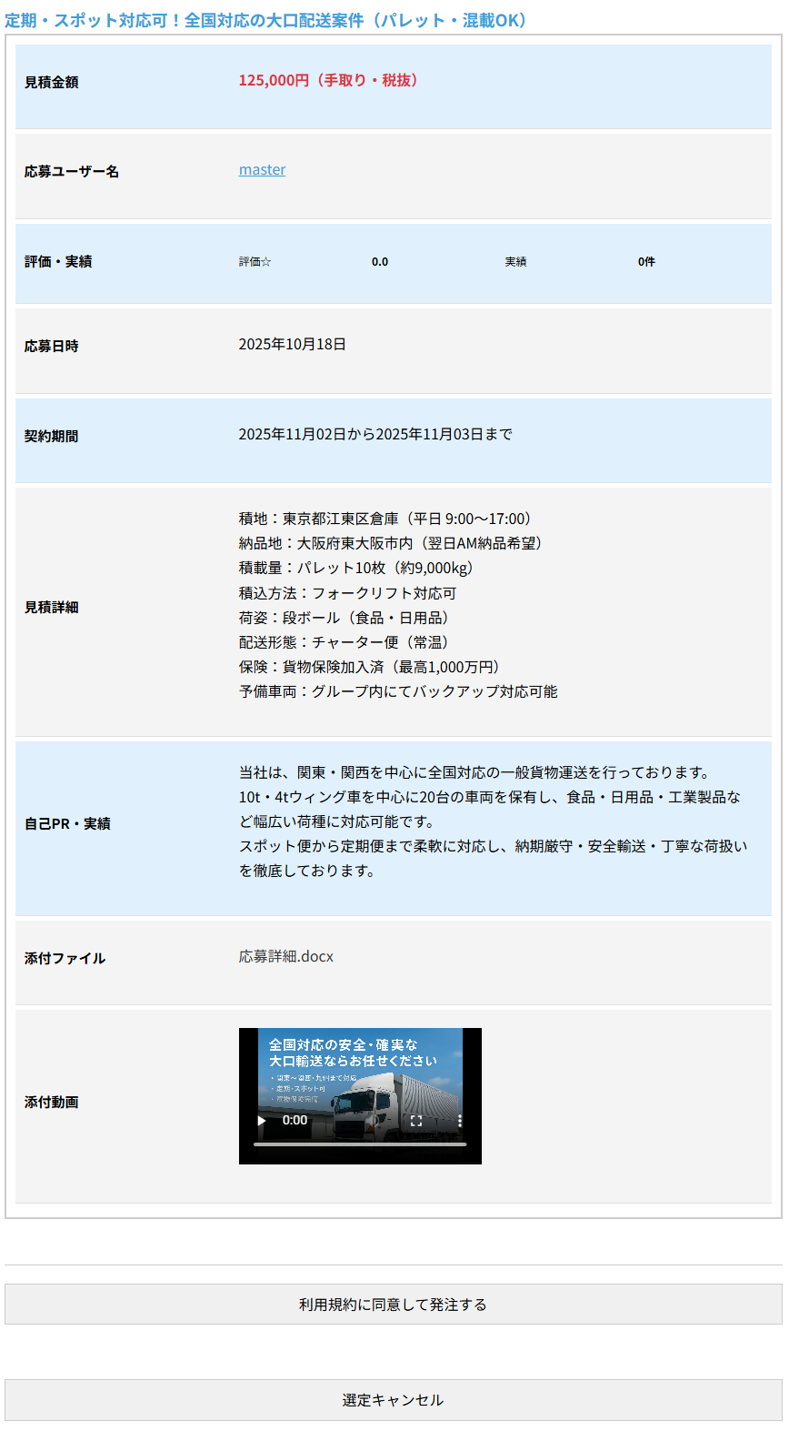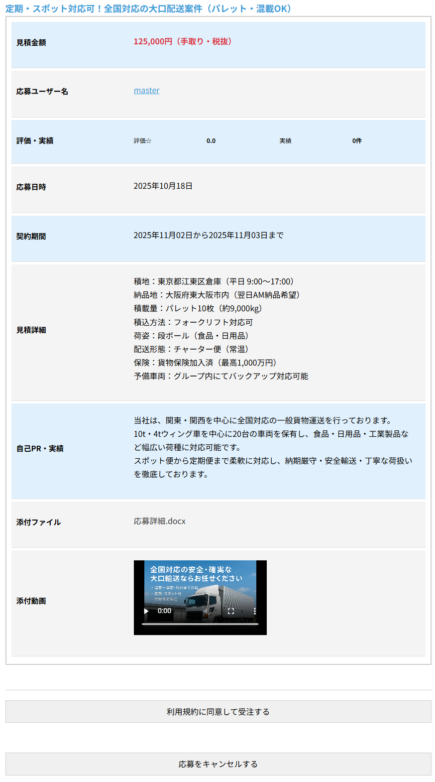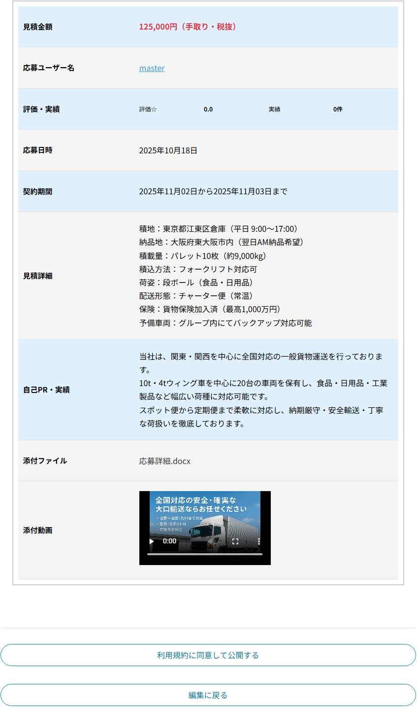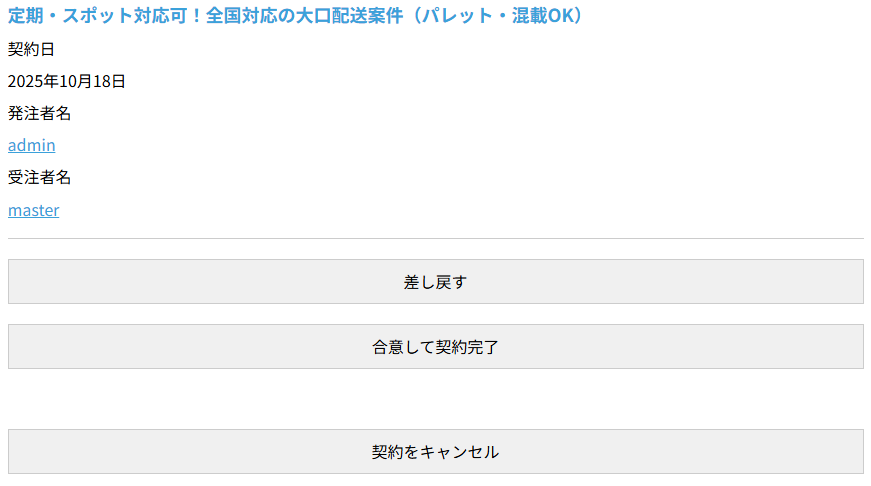 応募者が条件を確認し、「利用規約に同意して受注する」ボタンをクリックすると、契約内容の確認画面(契約表示画面)が表示されます。