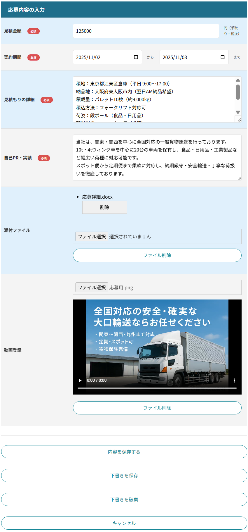 入力には時間がかかる場合もあります。途中で入力を止めて、後から続きをしたいときは「下書きを保存」をクリックしてください。次回、案件応募ページを表示したとき、自動的に下書きが読み込まれます。